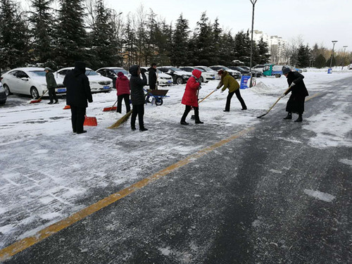 倏忽銀臺搆,俄頃玉樹生。1月15日,2019年第一場雪籠罩了峽山區創新創業服務中心園區。為業主和辦事群眾出行安全,峽山片區管理處啟動極端惡劣天氣應急預案,主動響應,頂風冒雪,以保安保潔為尖兵,分路段開展掃雪除冰工作。降雪持續一上午,項目人員不懼嚴寒反復清掃園區主干道、辦公樓臺階。對積雪較厚、壓實路段  ......
